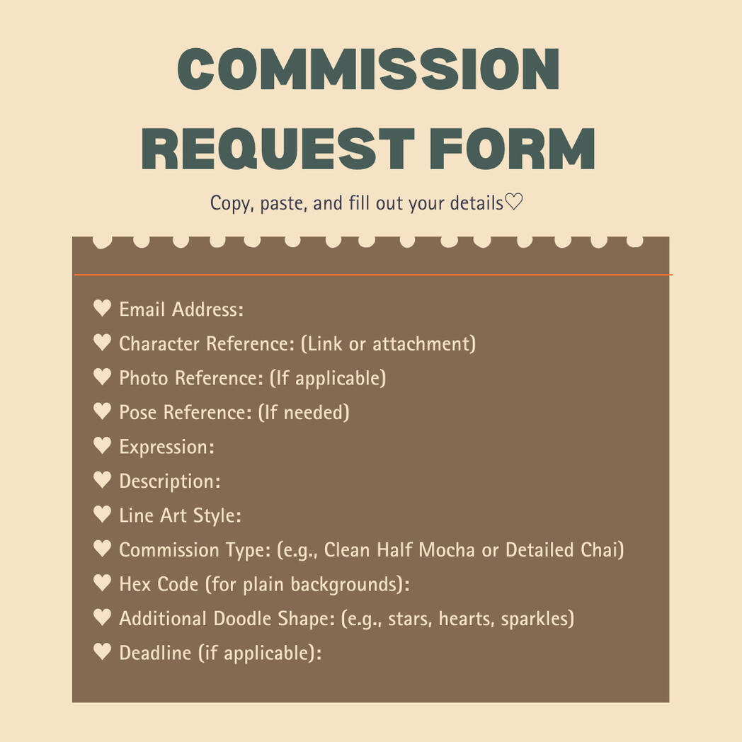 Once you have decided which type of commission you want, please fill in the details below.You may copy and paste ❤︎