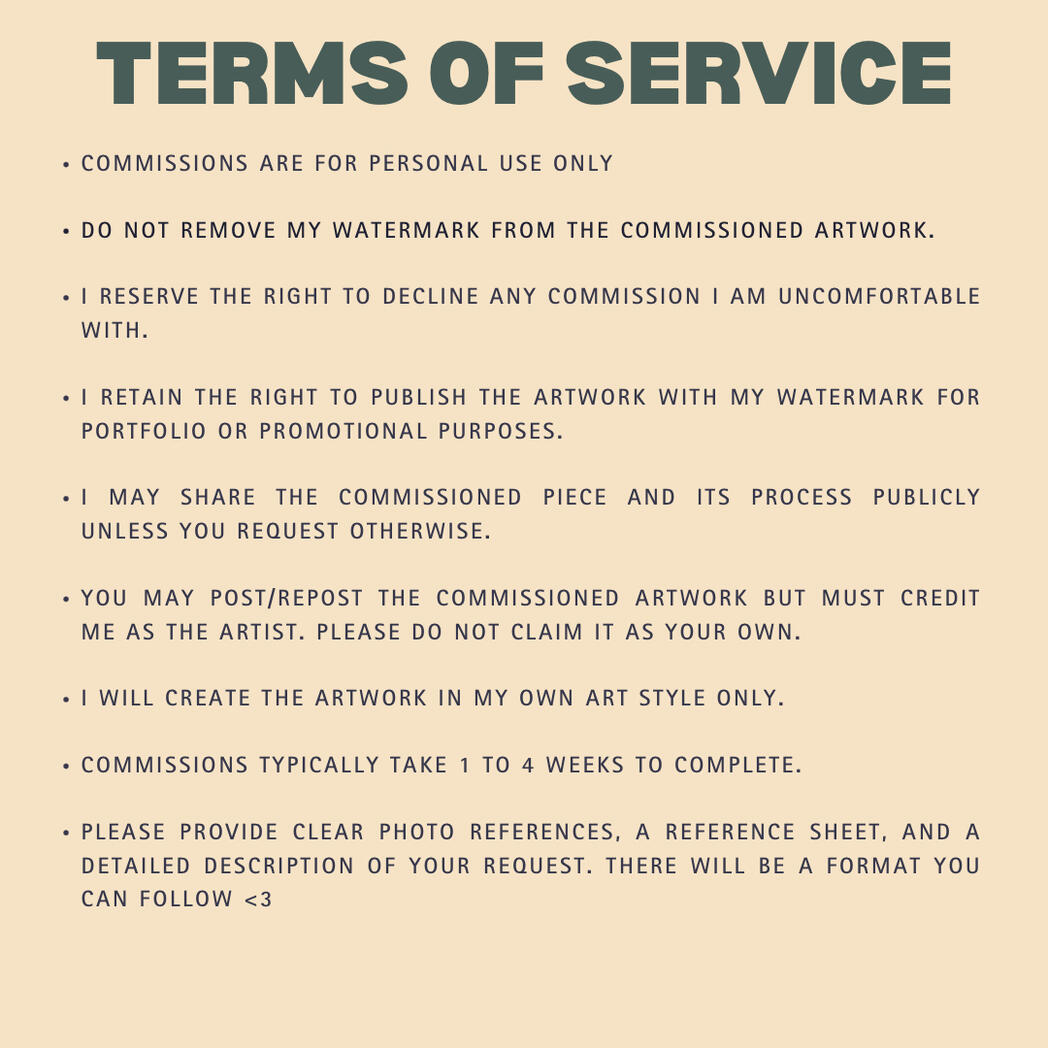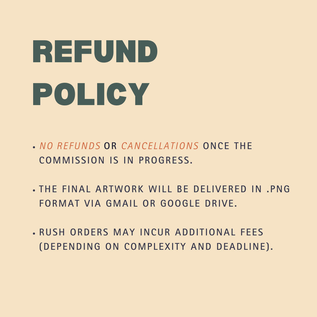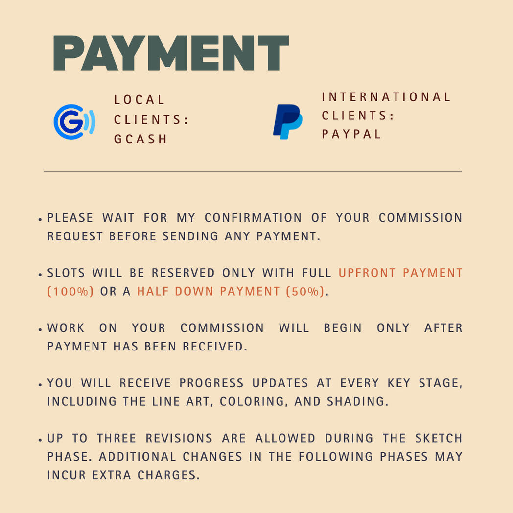 If your request is accepted, I'll send you a rough concept sketch after receiving the partial payment 50% upfront or the 100% full payment— you can give feedback before I move forward.This payment is also to reserve your slot.Afterward, I will provide you updates at every key stage of your commission (such as line art, coloring, etc.).NOTE:You may request minor modifications at each stage, but please note that you are limited to three changes per stage. Major revisions will cost extra!